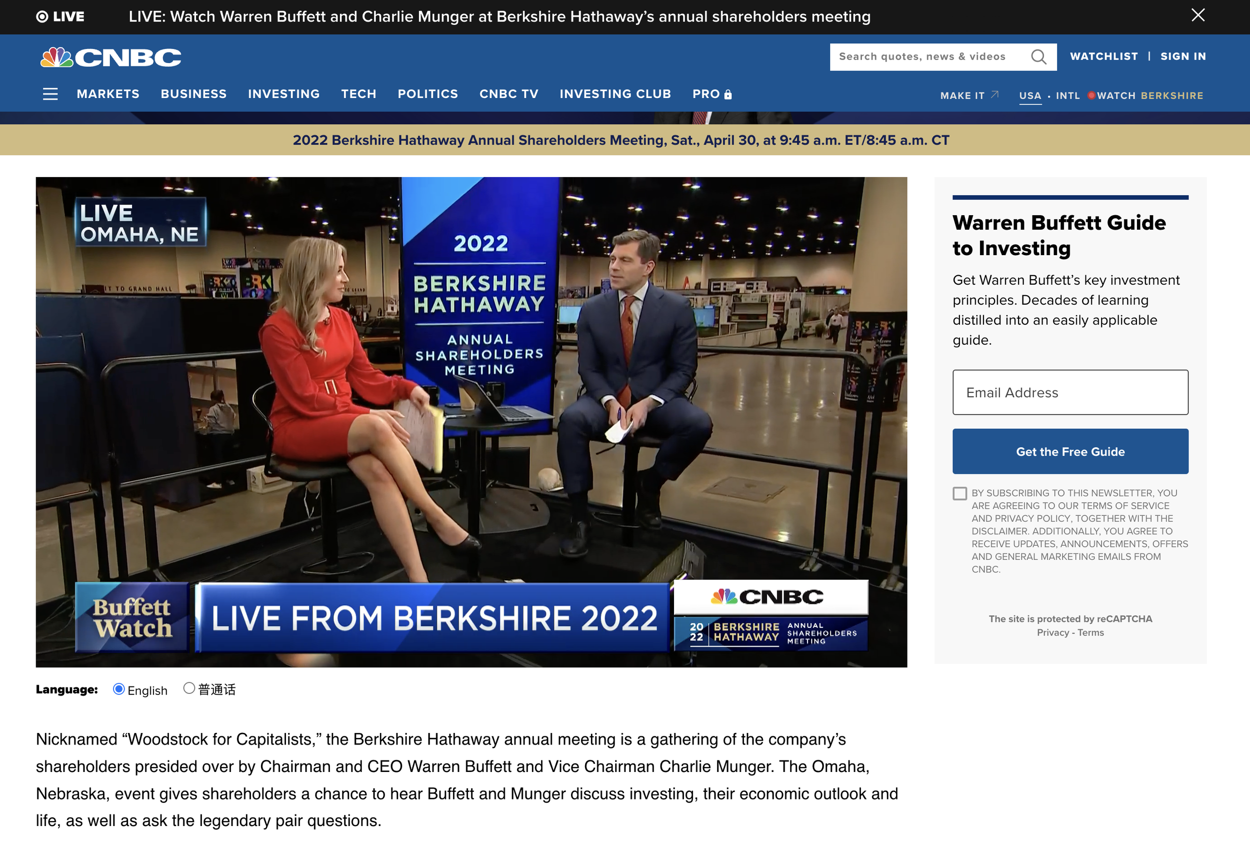 On Saturday April 30 2022, CNBC’s digital portfolio, across CNBC.com, iOS, Android, AppleTV, Roku and FireTV broadcast 8 hours of multi-language live coverage and analysis of the Annual Berkshire Hathaway Shareholders’ Meeting. The gathering of Warren Buffett’s portfolio and investors, and where he and Vice Chairman Charlie Munger lay out their insights, thoughts and perspectives on the current state of the markets, global economic headwinds, and positions of where to potentially head next.